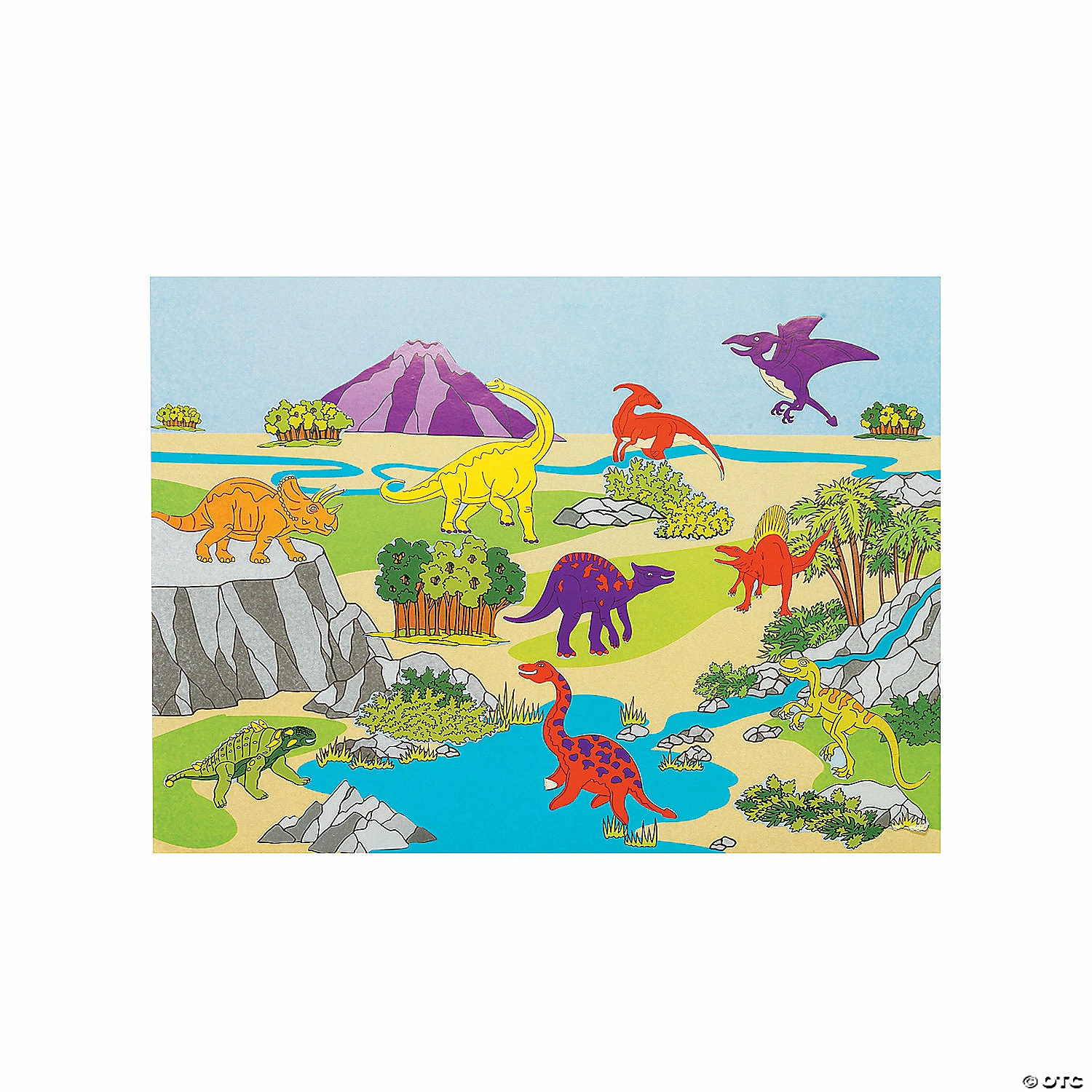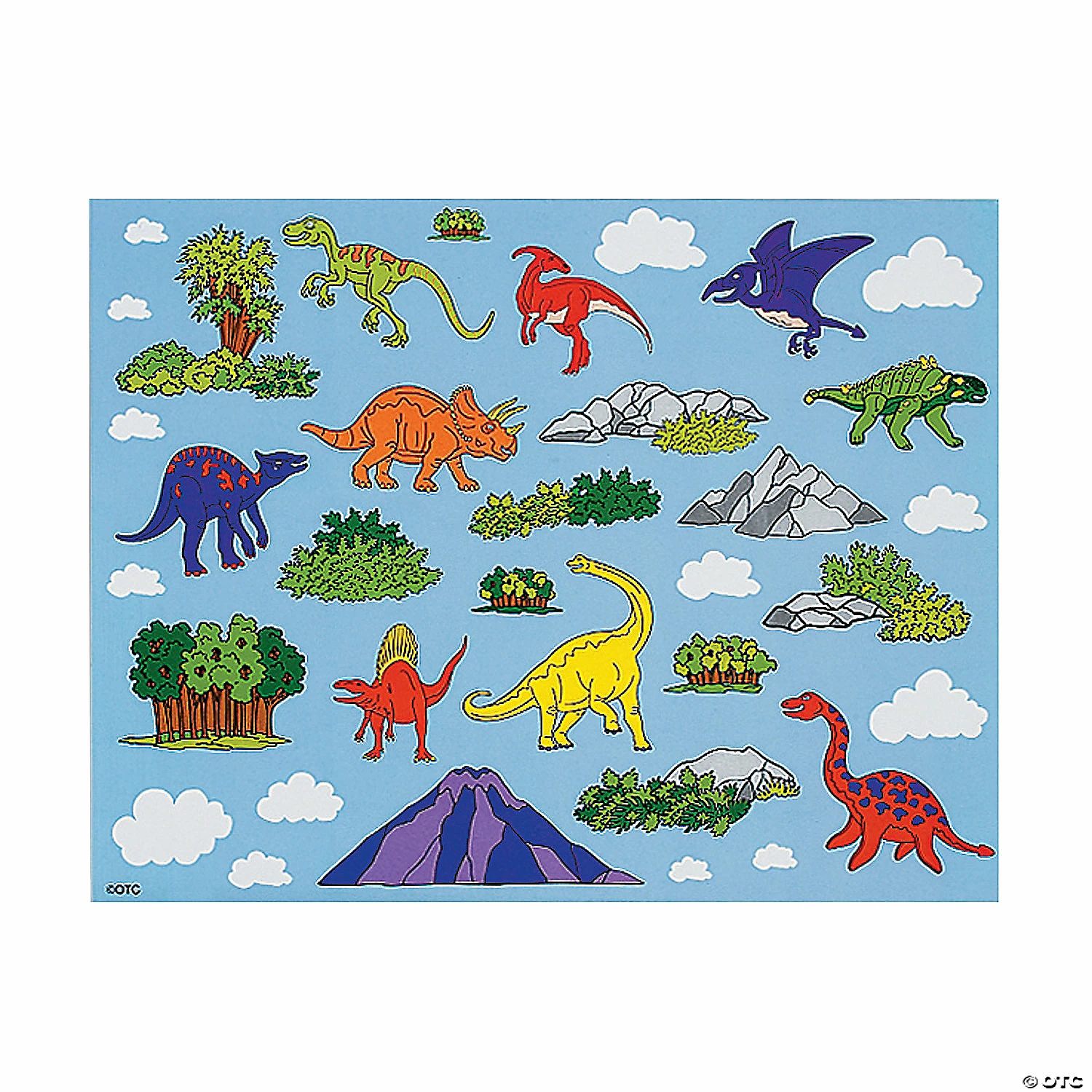 Travel back in time and arrange dinosaurs on landscapes for prehistoric fun! Includes 12 paper 11″ x 8 1/2″ backgrounds and 12 sticker sheets. Stickers are repositionable. (34 stickers per sheet © OTC